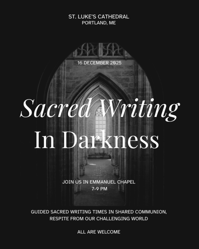 Poets Shana Rose, a parishioner at St. Luke’s, and Julia Baker, chaplain at Mercy Hospital and parishioner at St. Alban’s, Cape Elizabeth, are hosting a new ecumenical ministry at St. Luke’s Cathedral. “Sacred Writings in Darkness,” will be a time every month for guided sacred writing—poetry, prayers, songs, vignettes, etc—with a different theme every session. The gatherings are designed to help spiritually feed participants longing for respite from the chaos of our wider world right now. They will begin with Baker and Rose providing simple grounding content like a prayer or brief message, and the rest of the sessions will be for participants to write, followed by time at the end for sharing their completed work.