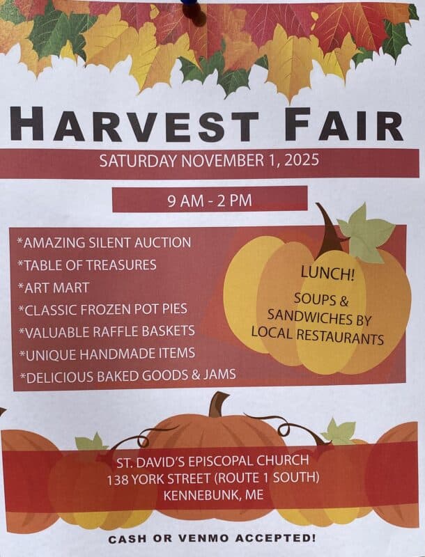 At St. David’s annual Harvest Fair, good food abounds with delicious baked goods and sweets for sale along with homemade frozen pot pies and jams and jellies. Lunch will be a special treat featuring sandwiches and soups by outstanding local providers.