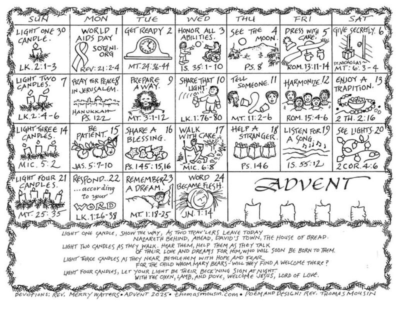 St. Peter’s, Portland rector, the Rev. Tom Mousin shares his annual Advent calendar, which he creates in partnership with the Rev. Merry Watters. Reading the appointed scripture for for each day, and perhaps coloring the pictures, helps us to focus on the Christmas story as it has been revealed to us over the course of human history. The poem included on the calendar can also be sung as a hymn. Learn more and download the free calendar here.
